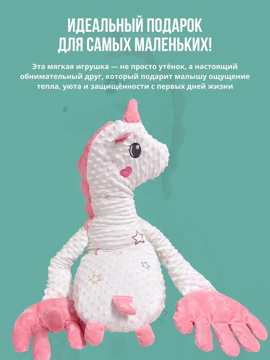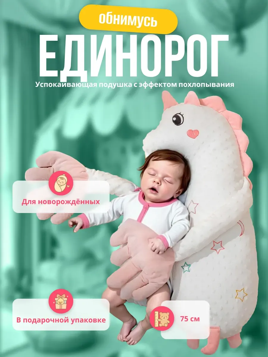 Плюшевая подушка-игрушка «Единорог обнимашка» помогает малышу успокоиться и заснуть, создавая ощущение объятий.